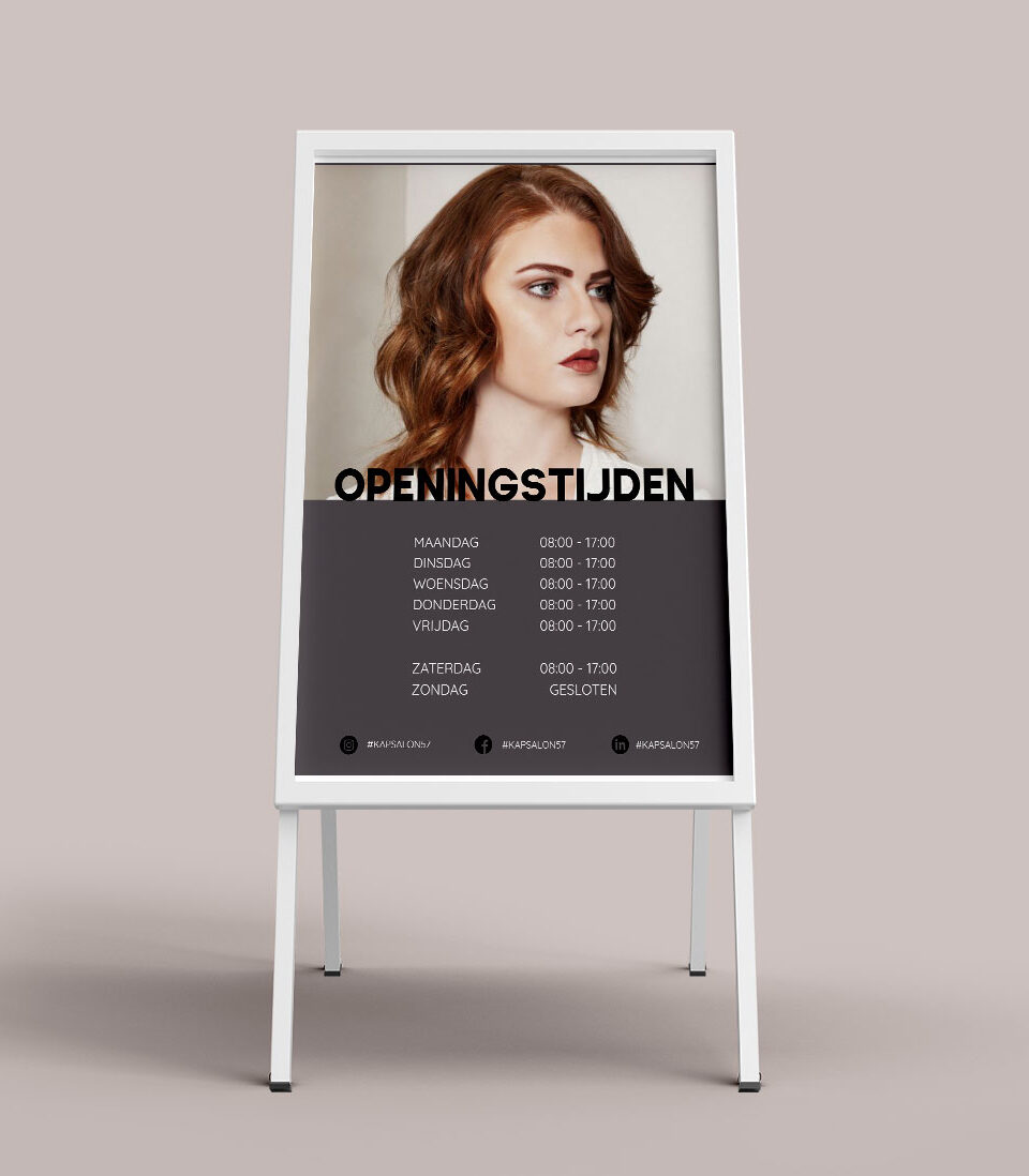 Wil je je eigen logo, tekst en/of afbeelding op de stoepbord poster? Voor maar €5,00 meer ontwerpen we een poster speciaal voor jou. Reageer op de orderbevestiging met jouw logo, tekst, kleur en/of afbeelding en wij gaan voor je aan de slag. Binnen 3 werkdagen ontvang je 3 digitale ontwerpen waar je uit kunt kiezen. Nadat je er één hebt uitgekozen, nemen we de bestelling in productie en wordt deze naar je opgestuurd.