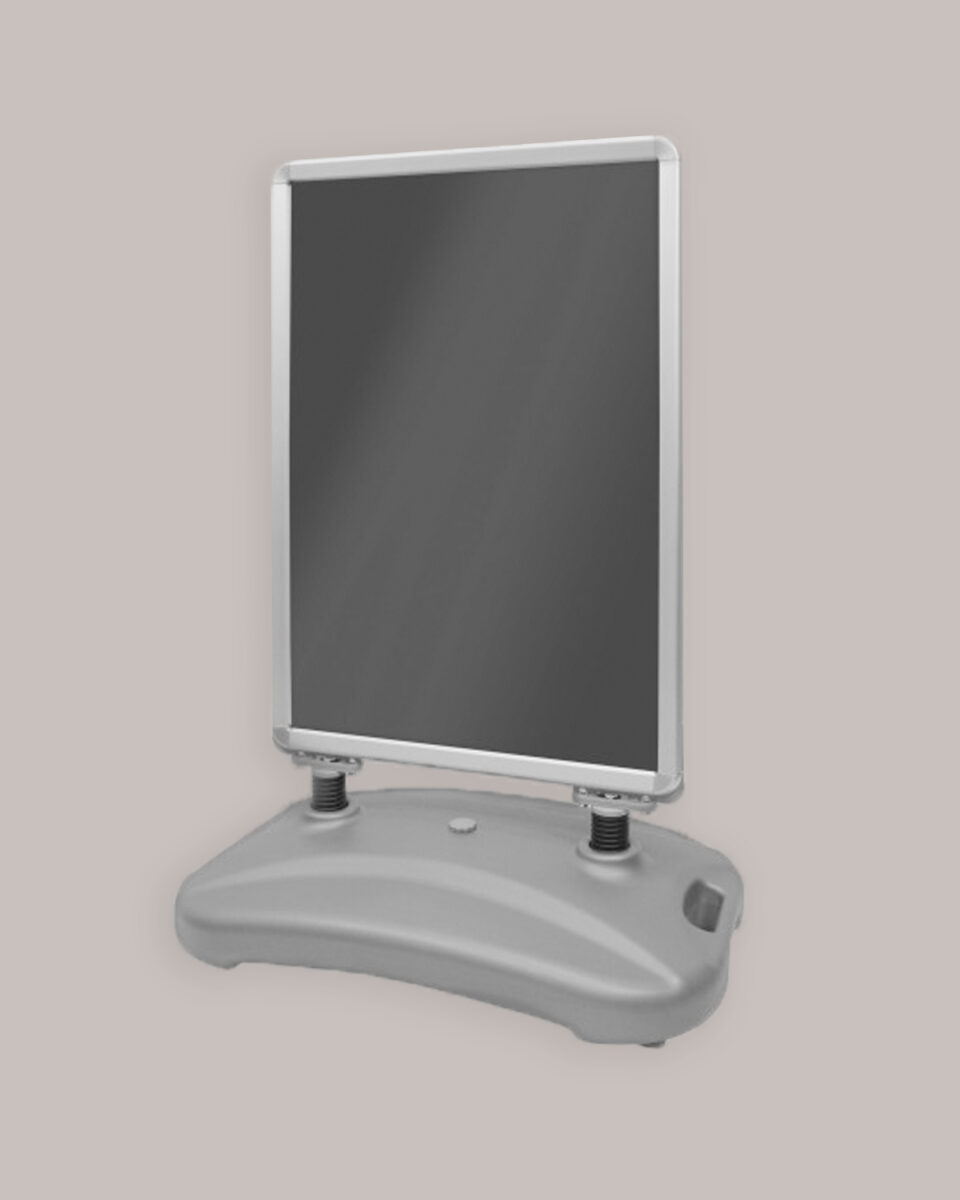 Dit stoepbord is waterproof en bestand tegen wind en regen. Ook is de watertank winterproef, omdat er zout in zit om bevriezing te voorkomen. De veren zorgen dat het bord in de wind kan meebewegen. De kliklijsten van het stoepbord hebben ronde hoeken. Hierdoor is het verwisselen van de posters eenvoudig en veilig. Het stoepbord met watertank is voorzien van 2 wieltjes, waardoor je het bord makkelijk kunt verplaatsen.